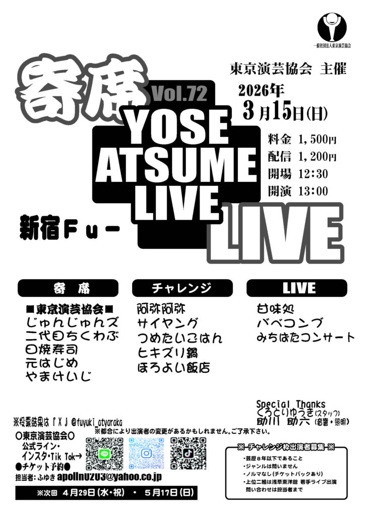 2026年3月15日(日)新宿Fu-「寄席+LIVE Vol. 72」